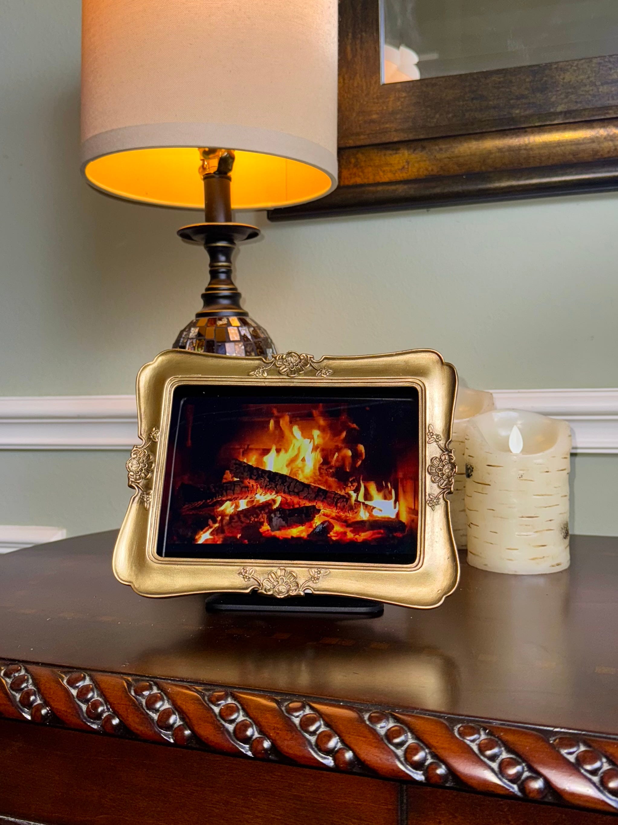 I’m obsessed with how this turned out! BRB- doing this to all my Alexas in the house! Just remove the back and glass from a photo frame, add some command strips, and stick it on.
